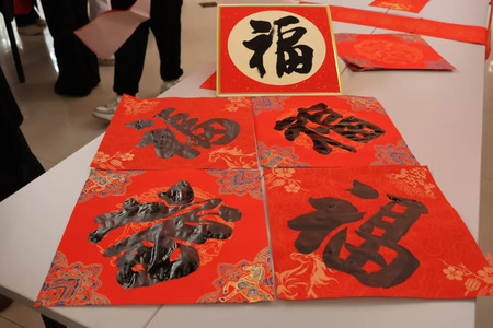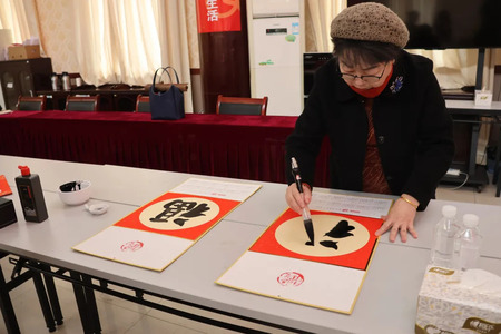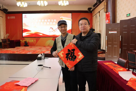 随后,一行人来到大礼堂活动现场,这里早已布置得年味十足,处处洋溢着喜庆热烈的氛围。开幕仪式简洁而温馨,随后便进入了本次活动的重头戏——现场写春联、送祝福。书法家们个个神采奕奕,他们铺开鲜艳的红纸,饱蘸浓墨,挥毫泼墨间,一副副寓意吉祥的春联跃然纸上。“瑞雪红梅报早春,金鞍宝马迎新岁”,描绘出对新春佳节的美好期许;“山清水秀天地美,鸟语花香气象新”,展现出对自然和谐、生活美好的向往。还有那一张张饱满圆润的“福”字,传递着浓浓的福气与大爱。